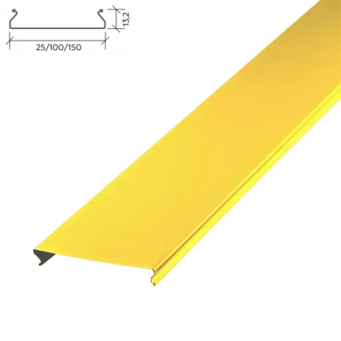 Потолок A150AS в золотом исполнении — это рейка шириной 150 мм из алюминия с декоративным покрытием «золото». Часто используется в залах, кафе, бутиках, фойе, гостиницах и других интерьерах, где важен яркий визуальный акцент и премиальный стиль.