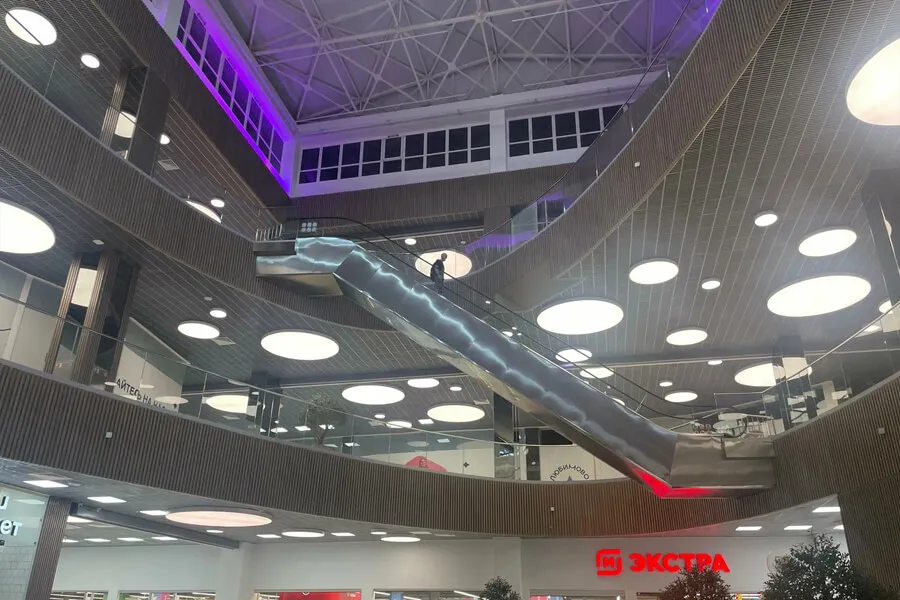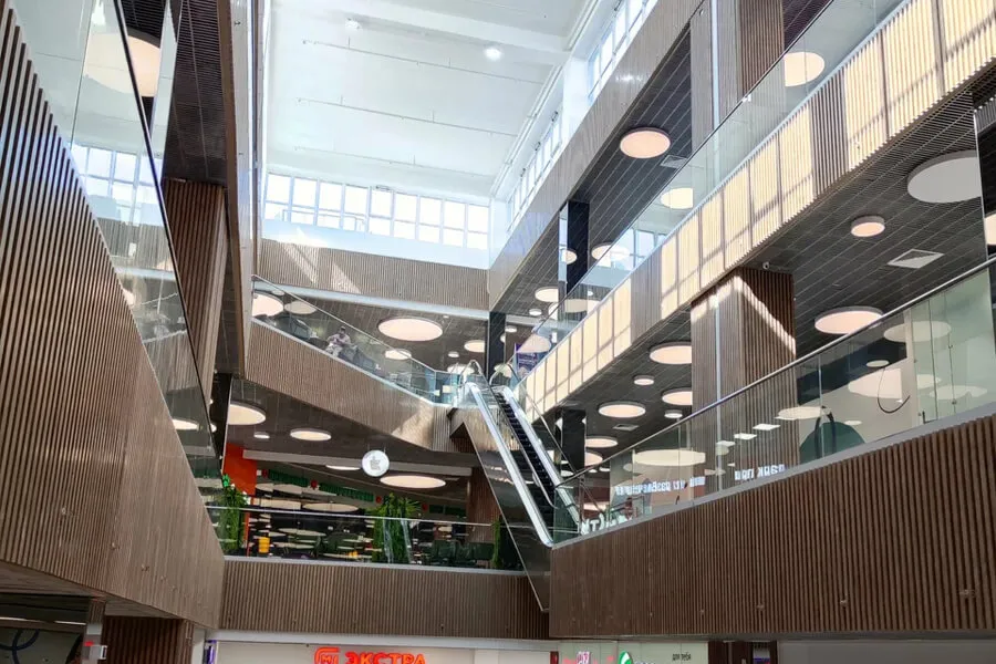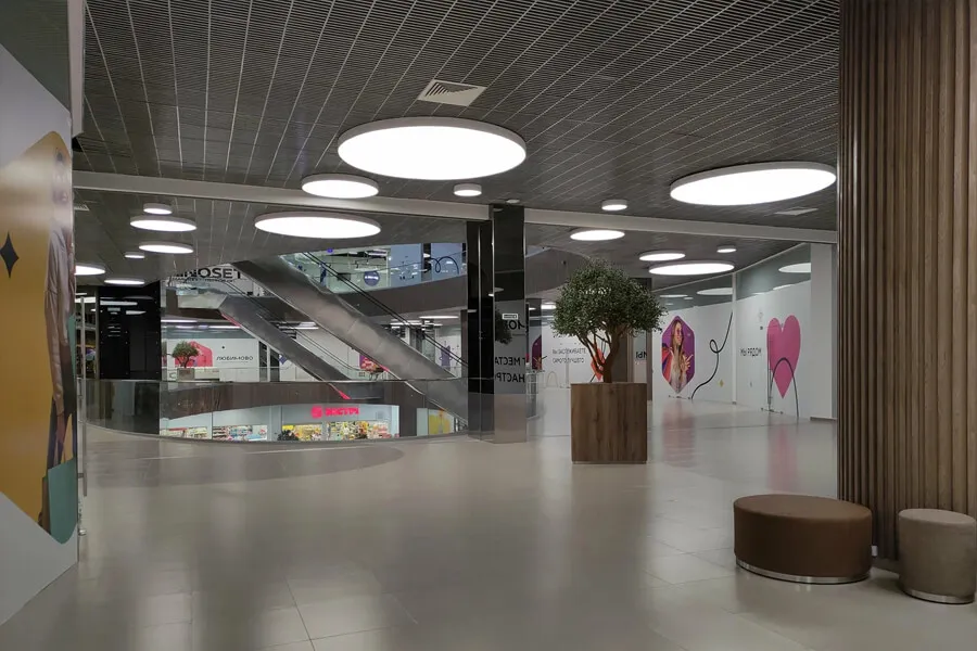 ТРЦ «Любимово» — это динамичное общественное пространство, где важны не только технические характеристики отделочных материалов, но и визуальное восприятие. Потолочные решения подбирались под каждую зону отдельно, с учётом её назначения и нагрузки.