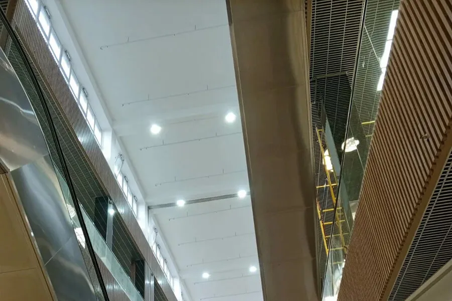 Комплексное оформление потолочного пространства в современном торгово-развлекательном центре с учётом высокого трафика, акустических требований и визуальной эстетики. Решения должны быть функциональными, легко обслуживаемыми и адаптированными под разные зоны комплекса.