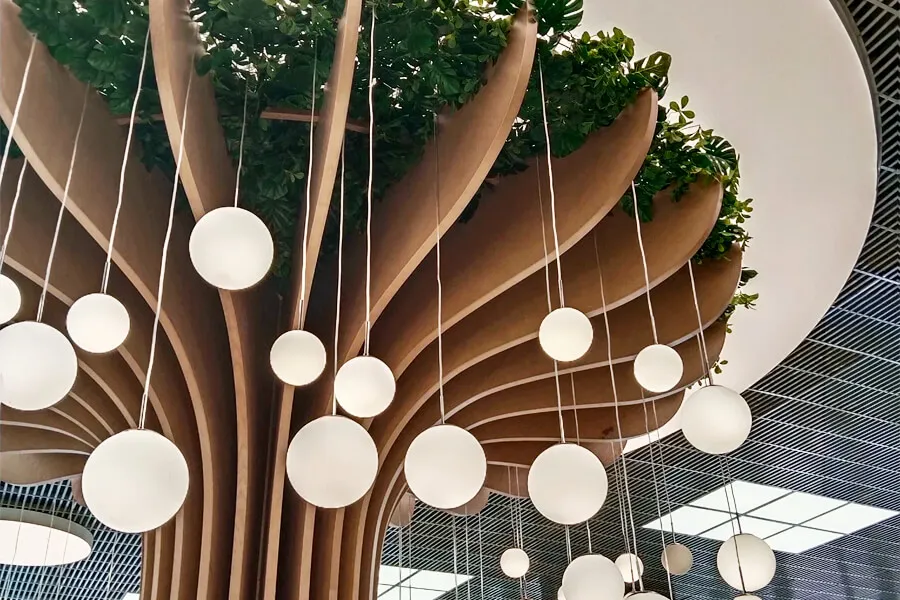 - Центральный декоративный элемент — «дерево» с подвесным освещением, формирующий узнаваемый визуальный центр пространства.